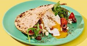 Directions: Spread yogurt inside pita, Fill pita with arugula, tomatoes, poached egg, olives, and feta. Sprinkle with za’atar.